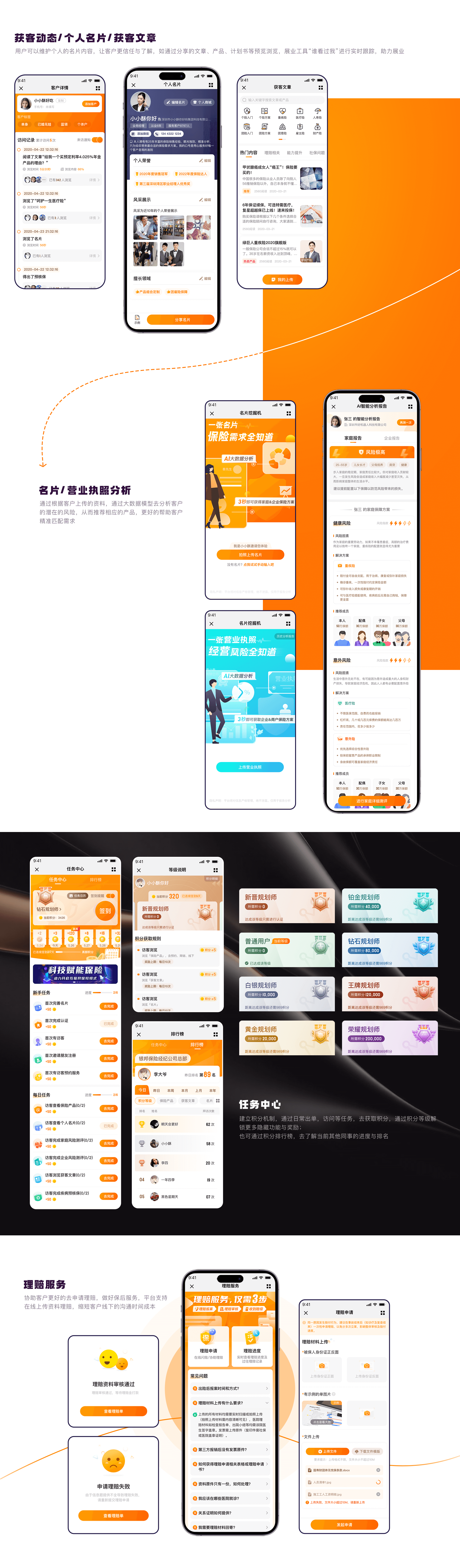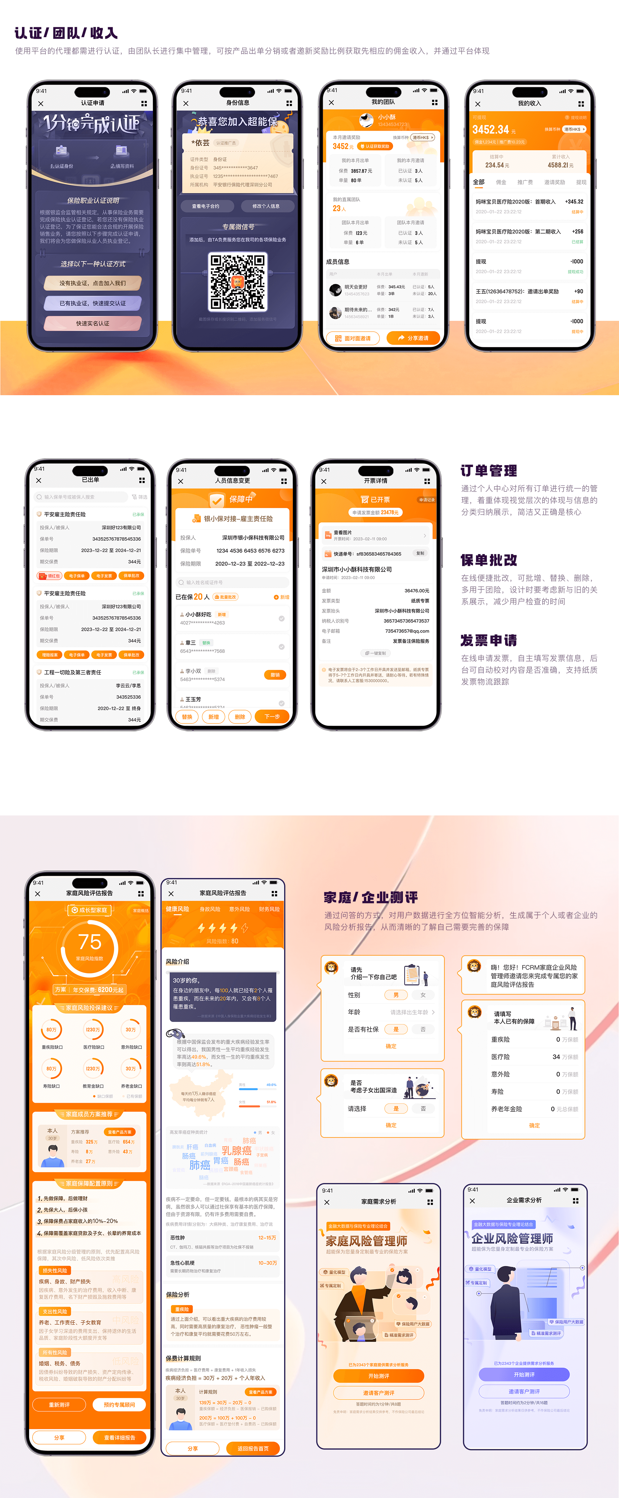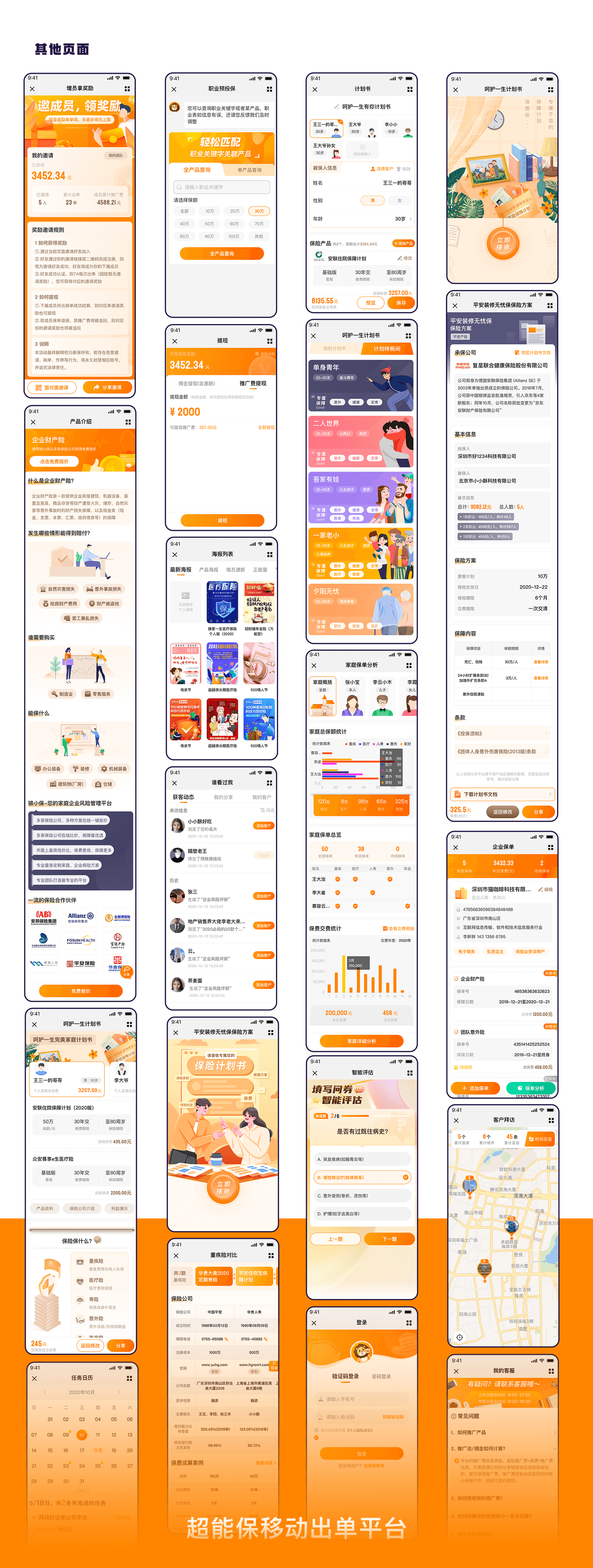 項(xiàng)目概述: 非車險(xiǎn)展業(yè)/出單/分銷平臺,面對保司與第三方經(jīng)紀(jì)代理支持:產(chǎn)品定制、線上投保、批改保全、電子保單等,實(shí)現(xiàn)線上投保閉環(huán) 豐富營銷工具助力業(yè)務(wù)員輕松展業(yè):訪客追蹤、名片分析、大數(shù)據(jù)風(fēng)險(xiǎn)測評、產(chǎn)品對比、保險(xiǎn)商城等 設(shè)計(jì)風(fēng)格: 以橙色為主色調(diào),傳遞活力與溫暖親和力。采用卡片式模塊化布局,流程設(shè)計(jì)聚焦便捷性,操作路徑直觀短捷,減少跳轉(zhuǎn)損耗,實(shí)現(xiàn)高效交互體驗(yàn)。以產(chǎn)品邏輯與視覺差異化提升產(chǎn)品在市場中的地位和競爭力
